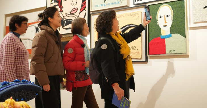 三位“织女”阿姨在春阳台参观展览,欣赏自己编织的作品